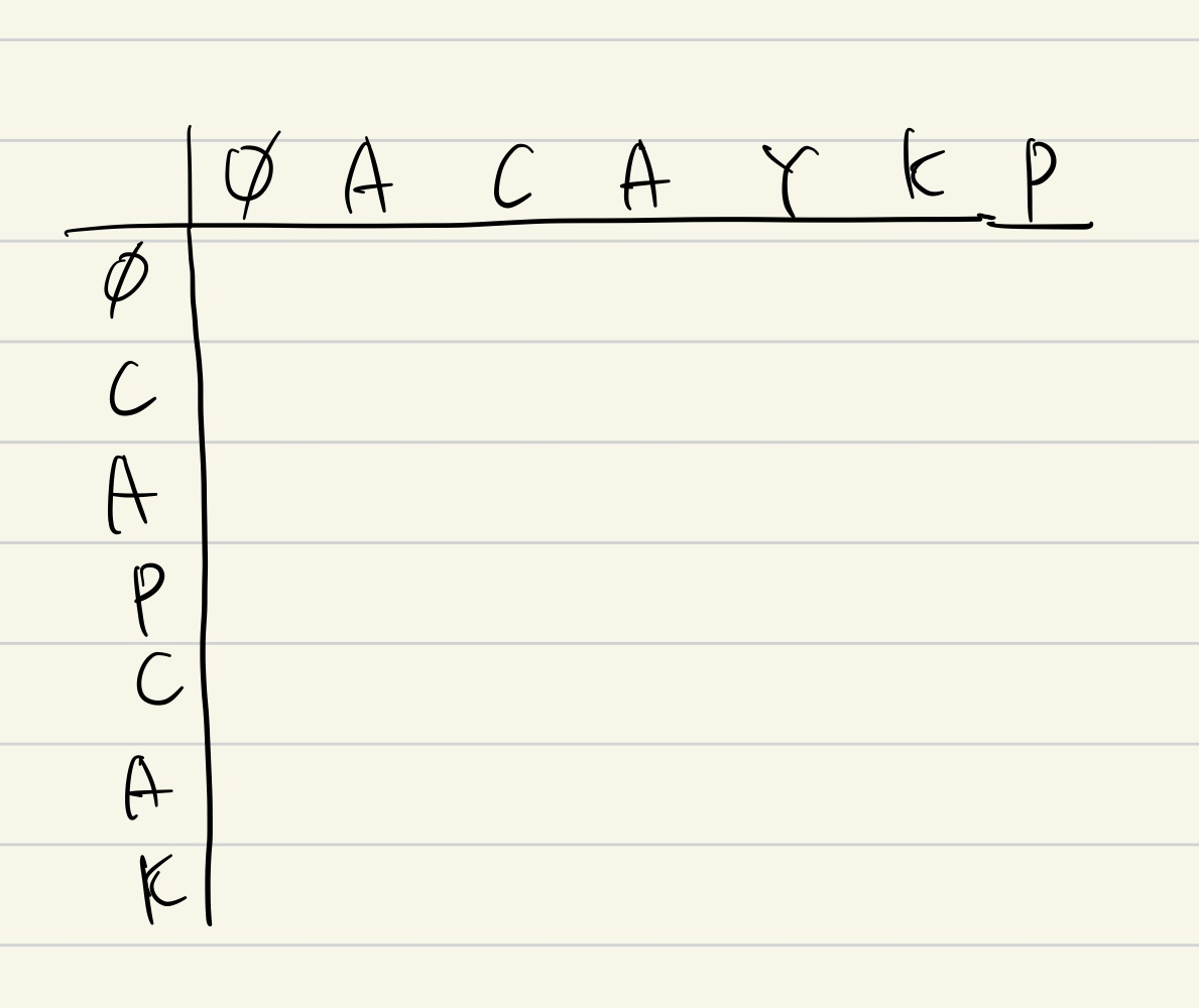 검사할 문자열이 ACAYKP, CAPCAK라고 하자. (백준 9252번의 테스트 케이스이다.)