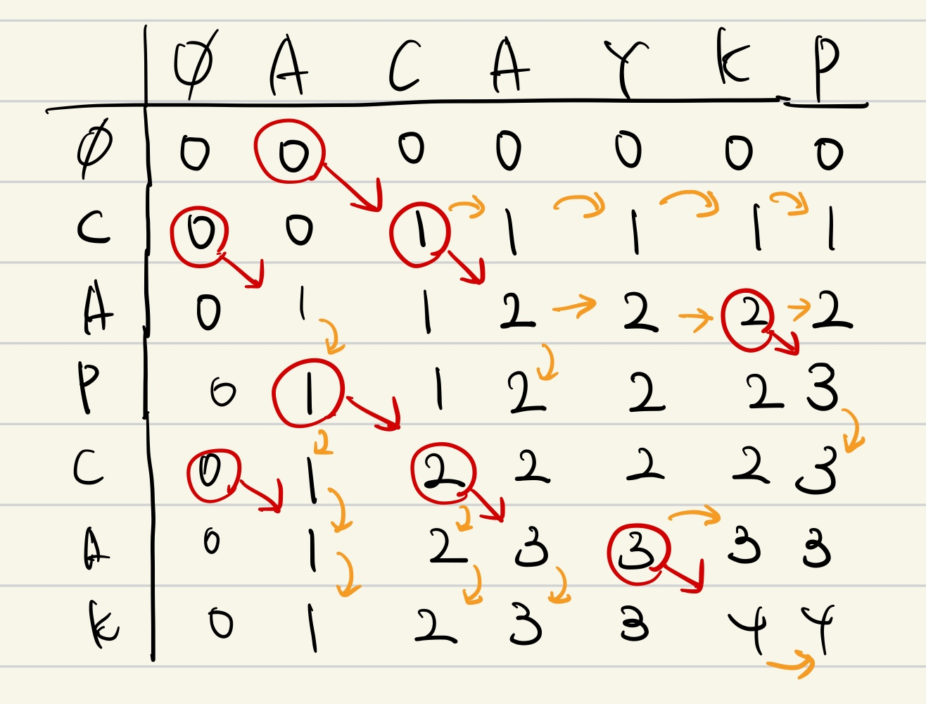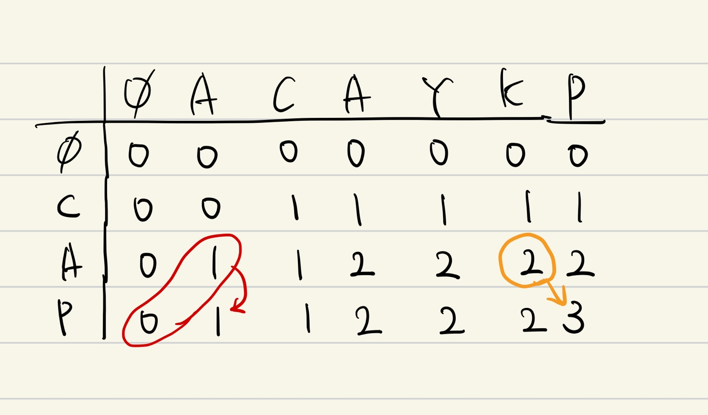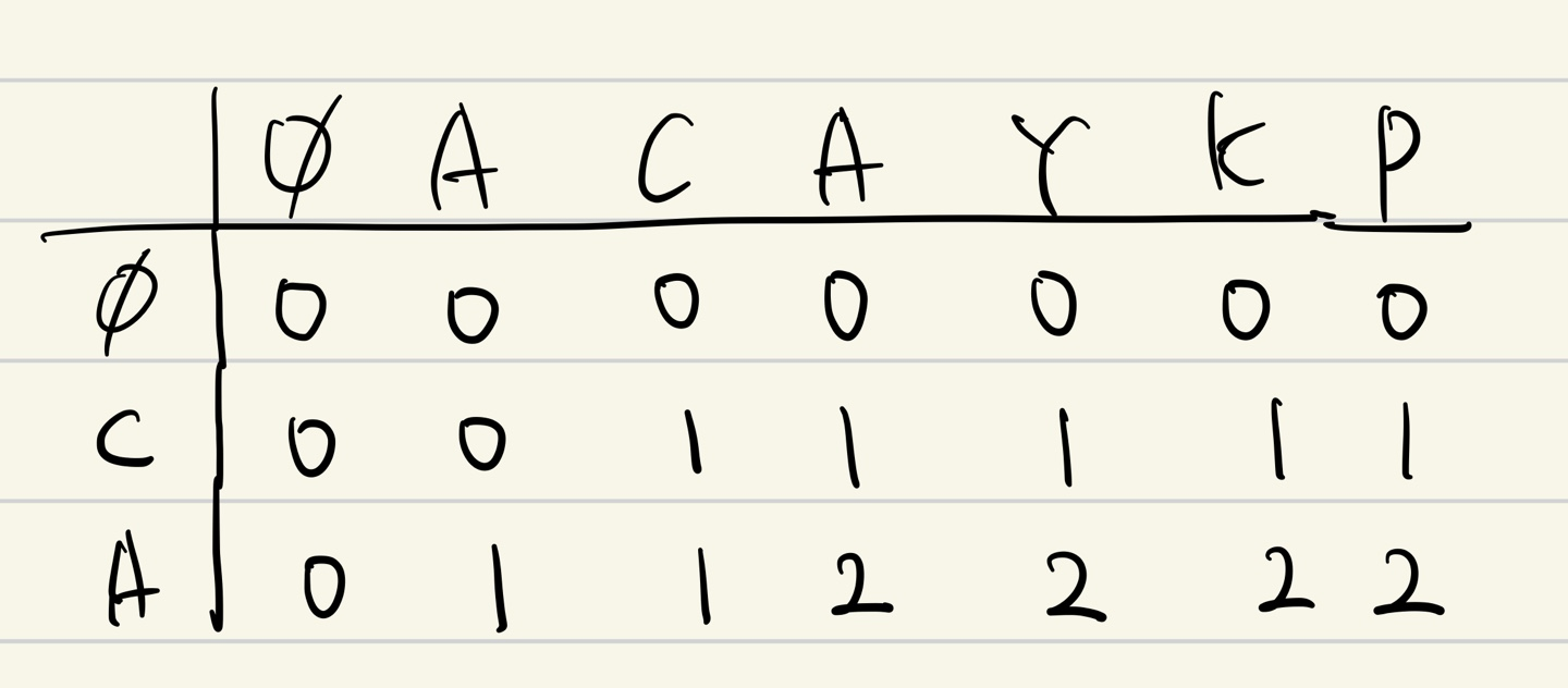 따라서 두 수열을 비교해 얻은 결과는 4이고, 실제로 겹치는 부분을 비교해보면 ACAYKP, CAPCAK로 4임을 알 수 있다.