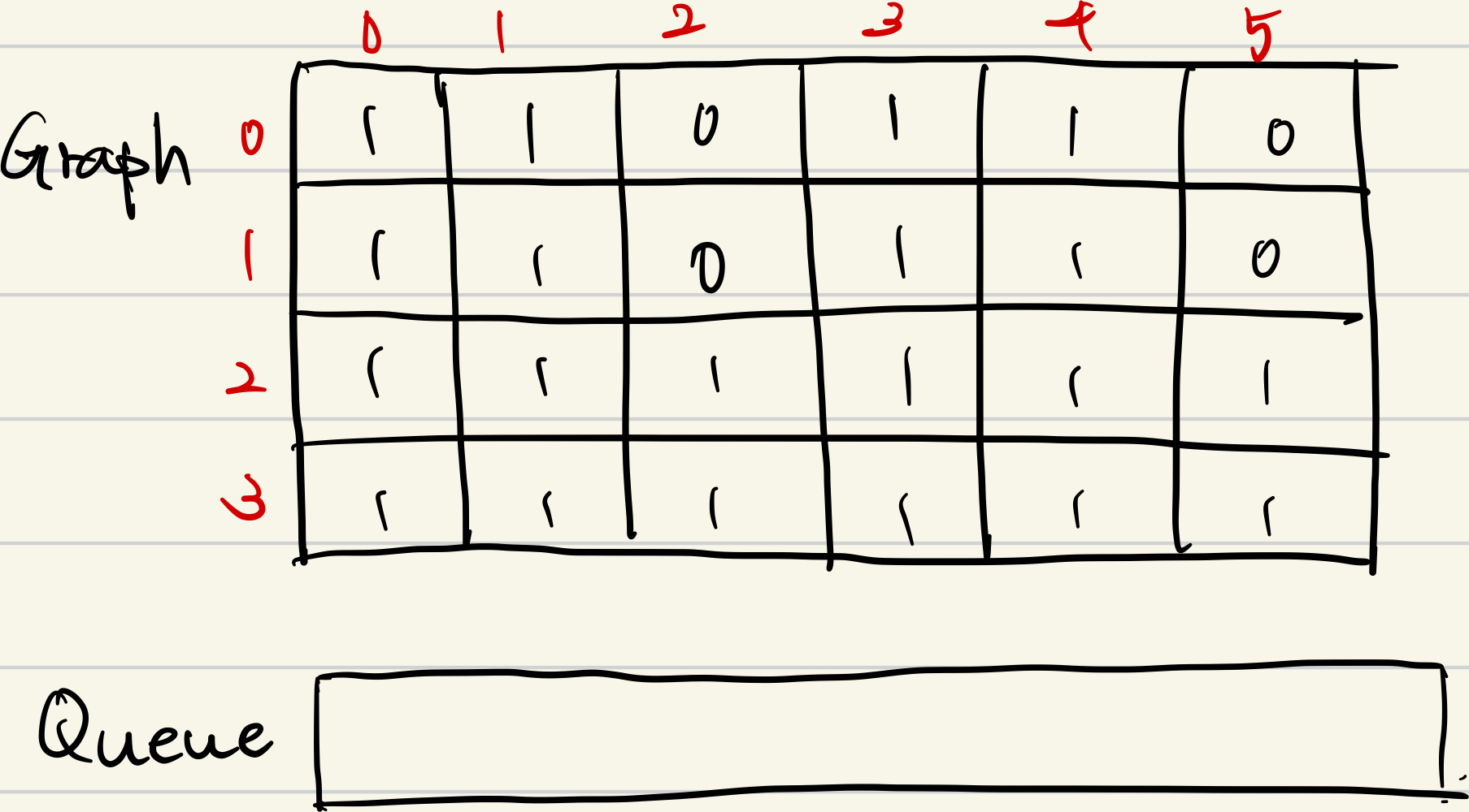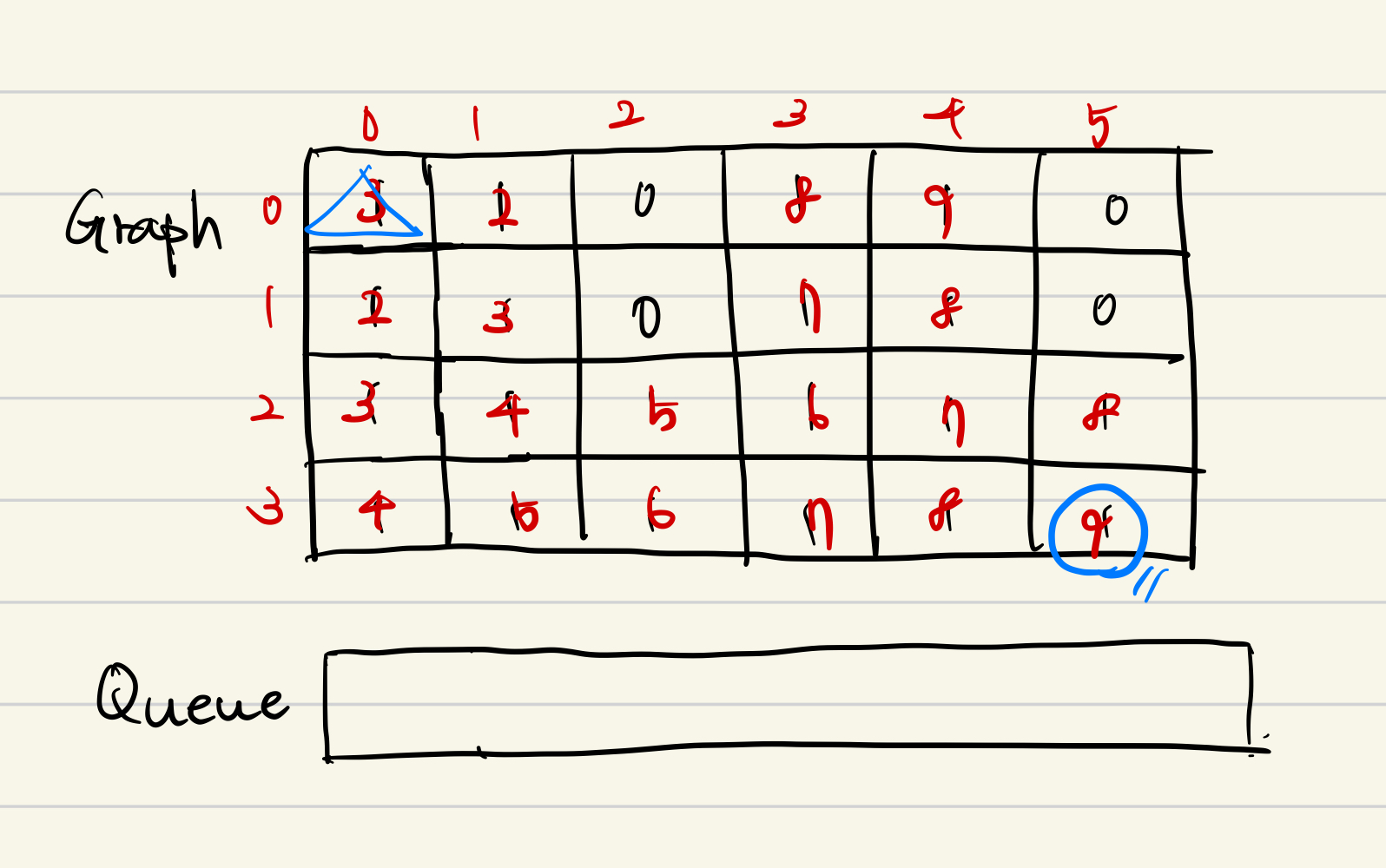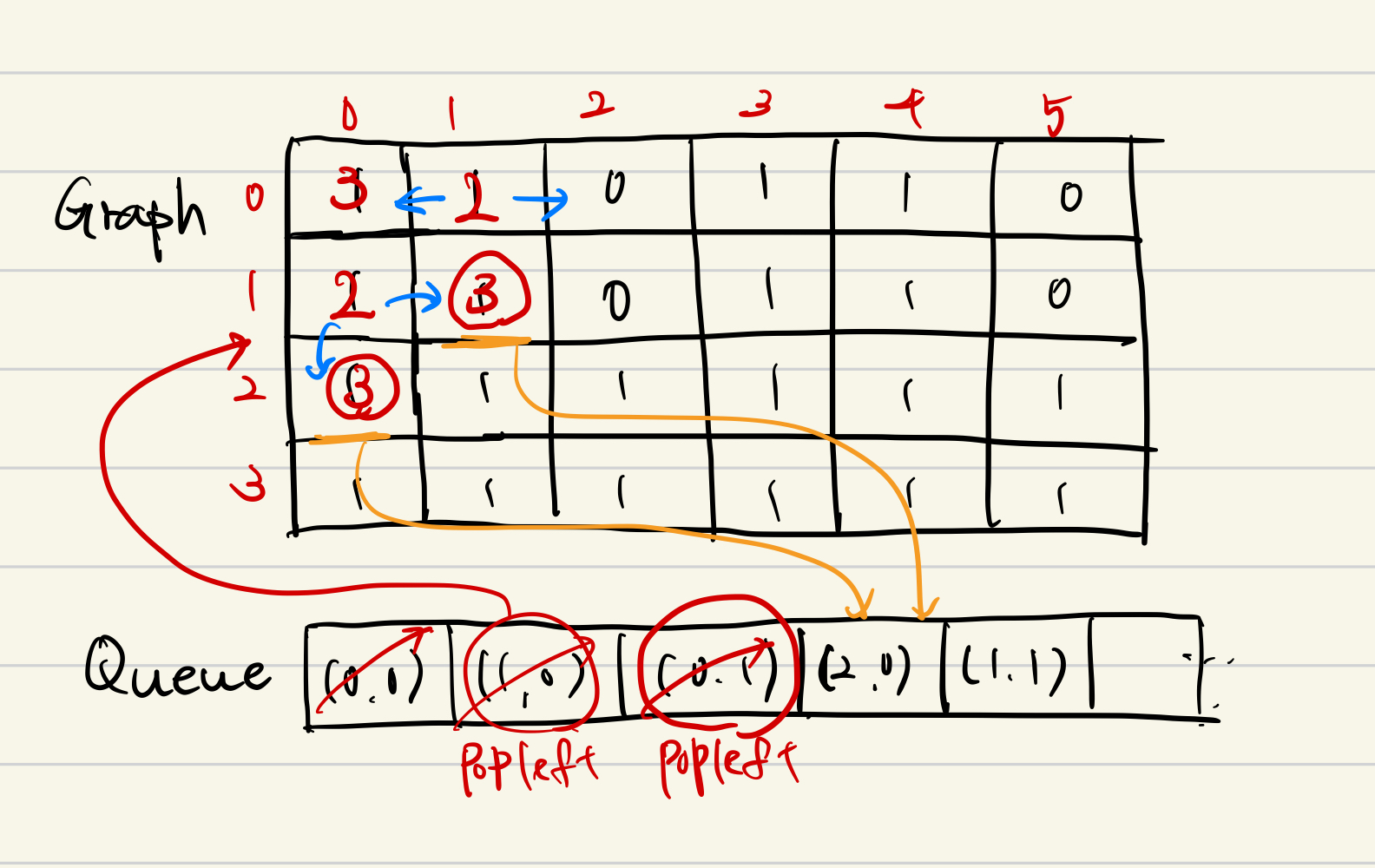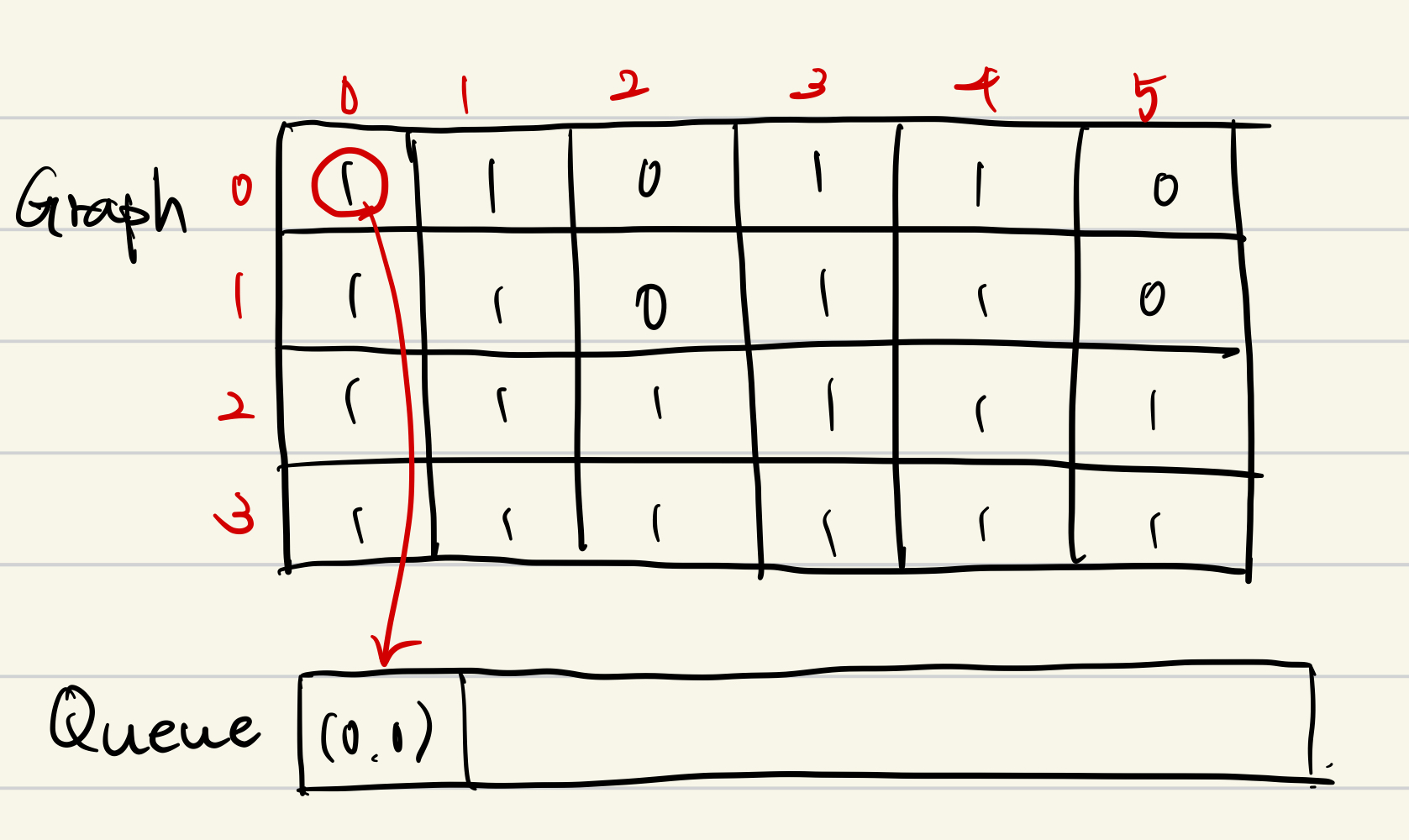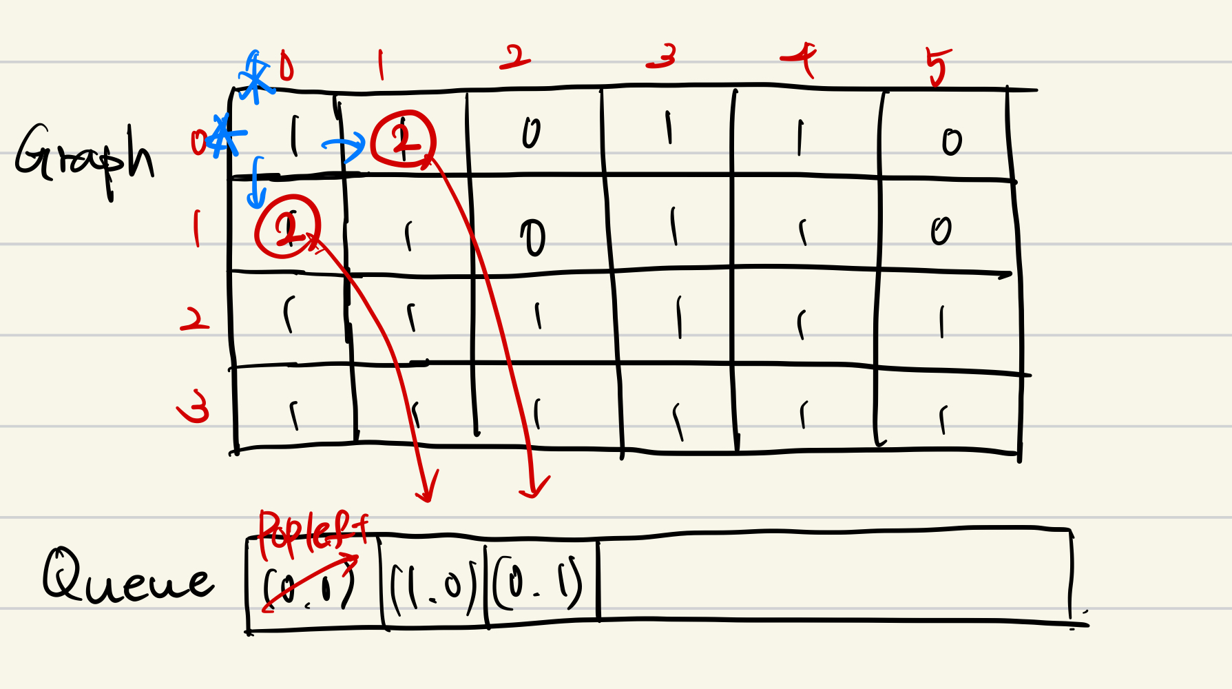 이제 큐의 다음 차례인 (1, 0) 좌표를 꺼내고 네 방향을 탐색한다.