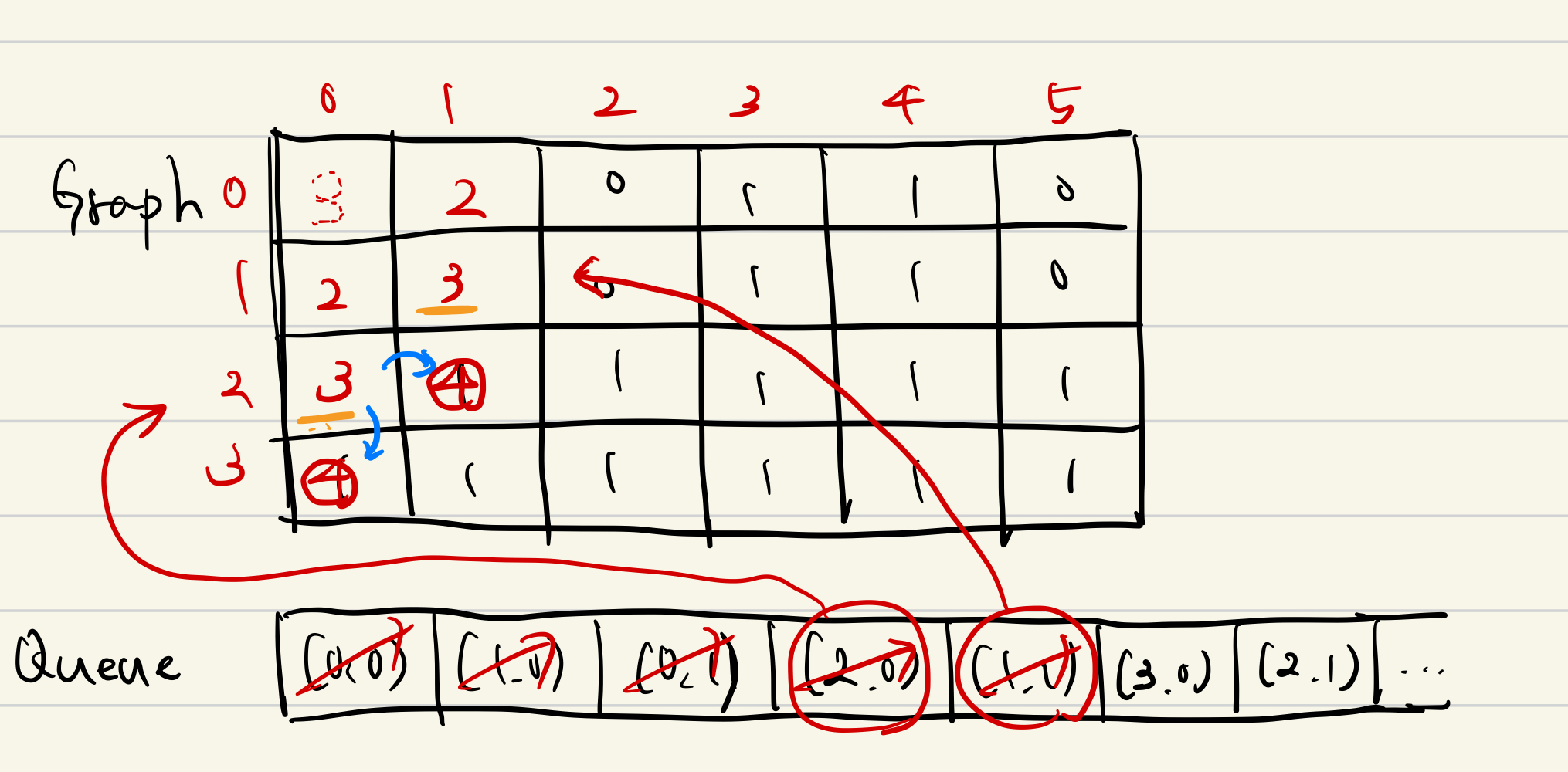 위와 동일한 방법으로 큐의 첫번째 좌표인 (2, 0)을 꺼내준 다음 네 방향 탐색을 실시하여 1인 좌표(전진할 수 있는 좌표)를 큐에 넣어준다.