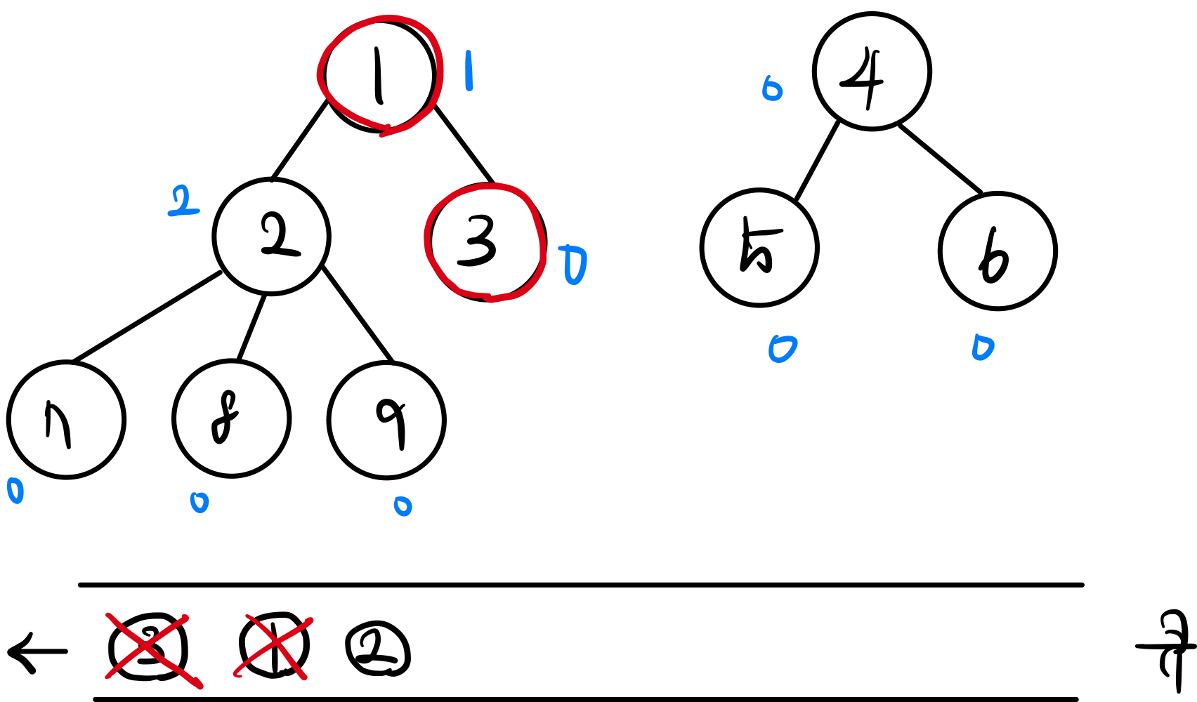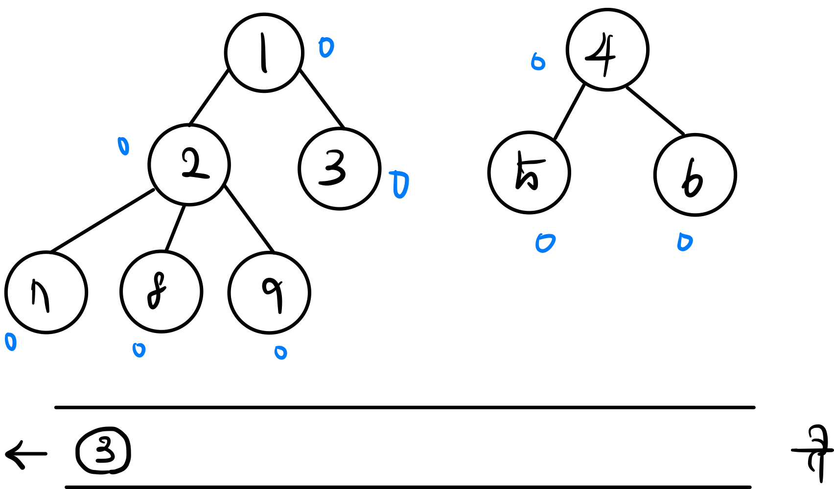 문제의 TC로 나온 예를 이용해 설명해보면, 처음에는 위와 같은 형태의 계층 구조가 있고 빈 큐를 이용한다.