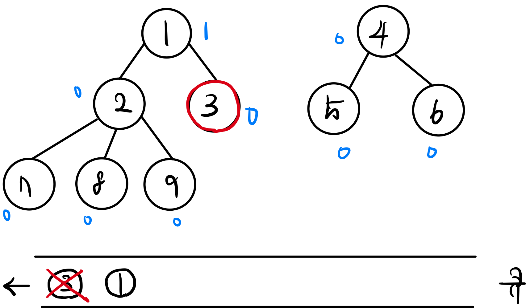 7번 8번 9번의 촌수를 2의 촌수인 2에서 1을 더한 3으로 바꾸어 준다. 1번은 이미 방문했던 번호이므로 촌수를 바꾸어 주지 않는다.